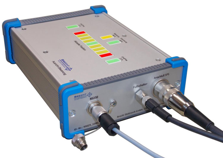 In einer Vorrichtung werden Abdeckhauben für Sensorelemente verschweißt. Die Ausricht-Steuerung unterstützt die Justage der Abdeckhaube zwischen den beiden Endlagen durch eine leicht ablesbare Ampelanzeige. Die Positionserfassung erfolgt mit einer handelsüblichen Messuhr. Die Messwerte werden durch das BlueDat Funksystem der Fa. Elias GmbH an die Ausricht-Steuerung übertragen. Durch die Funkübertragung kann die Vorrichtung frei beweglich, ohne Rücksicht auf Kabelführungen, ausgeführt werden.